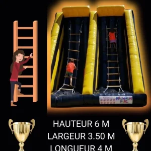 Grimpez vers la victoire avec notre Échelle des Champions ! Ce jeu d’escalade spectaculaire transforme participants en véritables alpinistes défiant la gravité. Deux échelles gonflables côte à côte pour des courses verticales palpitantes où équilibre et rapidité font les champions.