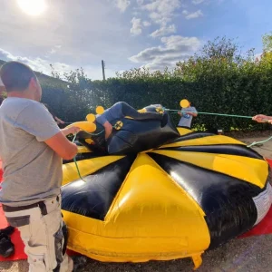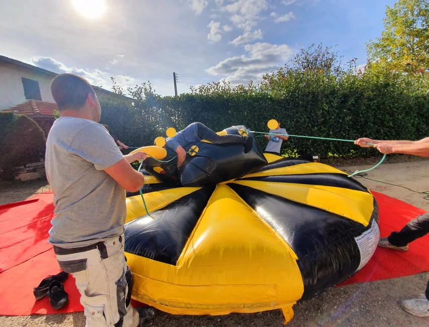Tenez bon sur le rodéo avec notre Rodéo à Cordes Gonflable ! Ce jeu spectaculaire teste l’équilibre et la résistance sur une plateforme rotative suspendue par cordes. Oscillations, rotations et fous rires garantis pour petits et grands cherchant à battre le record de temps.