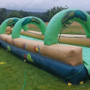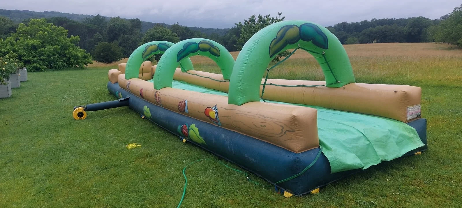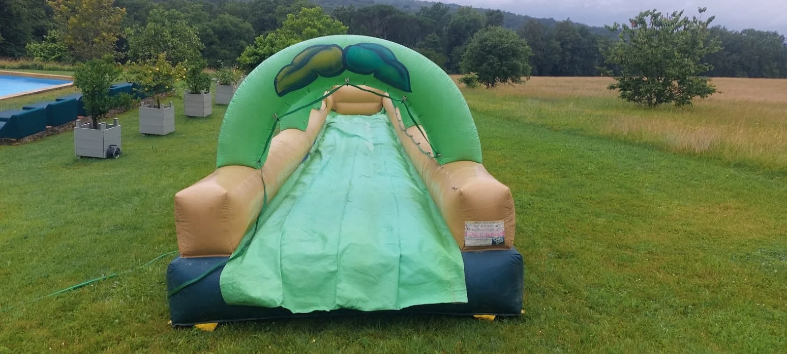 Structure idéale pour les anniversaires 5-14 ans juin-septembre, les campings animations estivales, les fêtes villages été, les événements municipaux canicule et tous les événements où vos enfants veulent glisser et s’arroser.